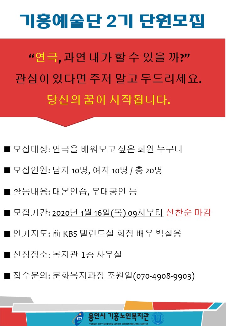 [문화복지과] 기흥예술단 2기 단원 모집안내 페이지 정보 작성자 문화복지과장조원일 댓글 0건 조회 1,772회 작성일 2020.02.25 본문 문의: 문화복지과장 조원일(070-4908-9903) 목록 이전글코로나 블루 극복하기 20.03.31 다음글[문화복지과] 용인시기흥노인복지관 기흥벗봉사단 모집공고 20.02.25 댓글목록 댓글목록 등록된 댓글이 없습니다.