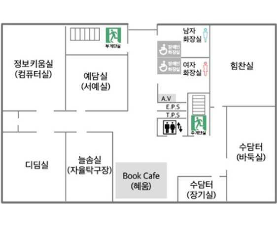지상 2층 | 정보키움실(컴퓨터실) / 예담실(서예실) / 디딤실 / 늘솜실(자율탁구장) / 수담터(장기·바둑실) / 힘찬실 / book cafe;(혜움) |